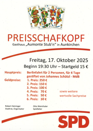 Einladung zum Traditionellen Schafkopfturniert am Freitag, 17.10., um 19.30 Uhr in Aunkirchen in der „Aumonte Stub’n“. Startgeld 15 €.